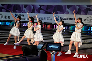 ボウリング場内では見慣れない光景に、観客も選手たちも最初は圧倒されていましたが、若さと華やかさが手拍子を誘い、一同が楽しい空気に包まれました。