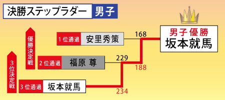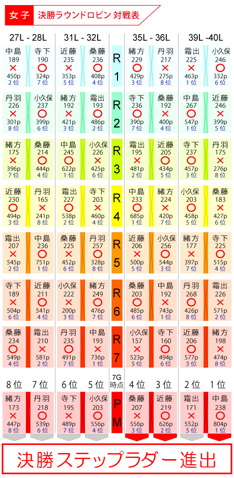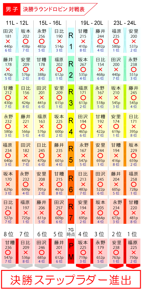 予選通過上位8名の選手がラウンドロビン方式(総当たりボーナスポイント方式)で戦います。