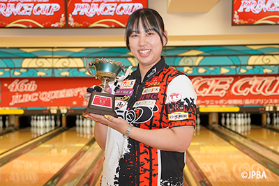 霜出からのスタートは9本カウント、坂倉はストライクでした。2フレはその逆で出だしは互角、先にダブルにしたのは4フレから霜出、坂倉は5フレから追いかけます。霜出のストライクはターキーでストップ、しかし坂倉のストライクは切れません。ボールが先で暴れるか、薄目厚めに苦戦の霜出、10フレに何とか合わせるも、坂倉のストライクは止まっておらず。坂倉はそのままオールウェイでの逆転で、嬉しい初優勝・初タイトルを勝ち取りました。