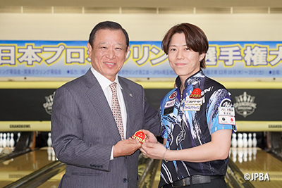 藤村隆史(57期 No.1394 株式会社コロナワールド)が今季の成績を以て自身の永久A級ライセンス取得が確定しましたので、「HANDA CUP 第59回全日本プロボウリング選手権大会」にて、谷口 健会長より金枠ワッペンの授与を行いました。